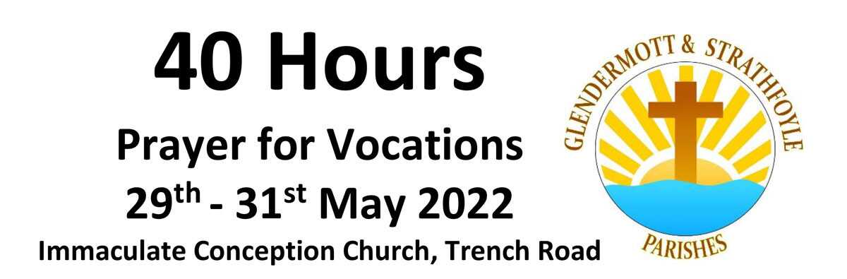 Bishop Donal has set a Year of Prayer for Vocation in our Diocese (17th March 2022-2023). The main intention for this 40 Hours Adoration is to pray for Vocations to the Priesthood and Religious Life from our Diocese.