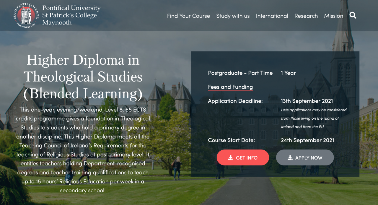 * This Higher Diploma meets all the Teaching Council of Ireland's requirements for the teaching of Religious Studies at post-primary level. It entitles teachers holding Department-recognised degrees and teacher training qualifications to teach up to 15 hours' Religious Education per week in a secondary school.