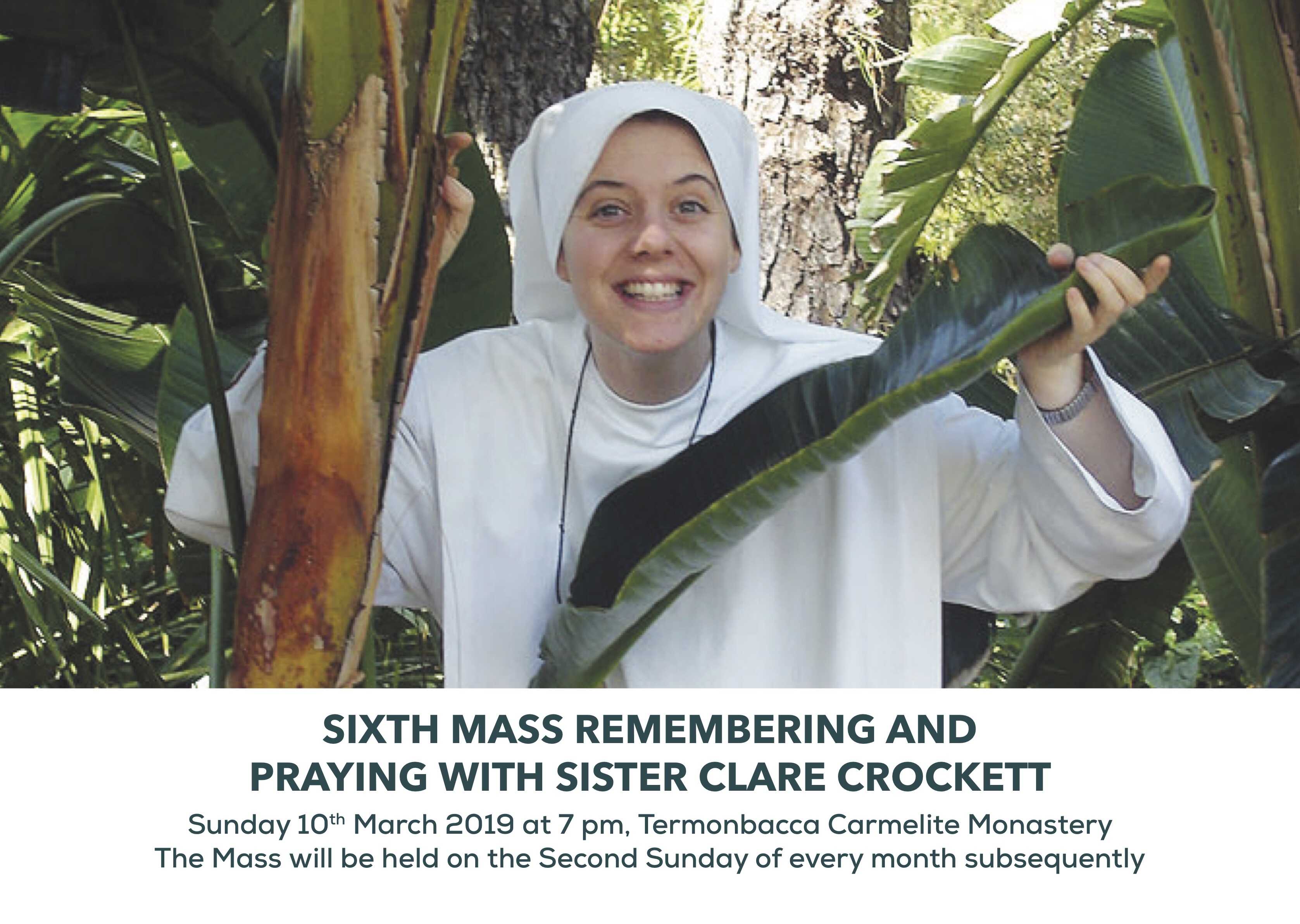The next MASS REMEMBERING AND PRAYING WITH SISTER CLARE CROCKETT is on Sunday 10th March 2019 at 7 pm in the Termonbacca Carmelite Monastery, Derry. The Mass asks from God the Father a miraculous sign that Sister Clare Crockett enjoys the vision of heaven. The C.O.R. youth group will be singing at the Mass. This Mass will be held on the Second Sunday of every month subsequently. All very welcome.
