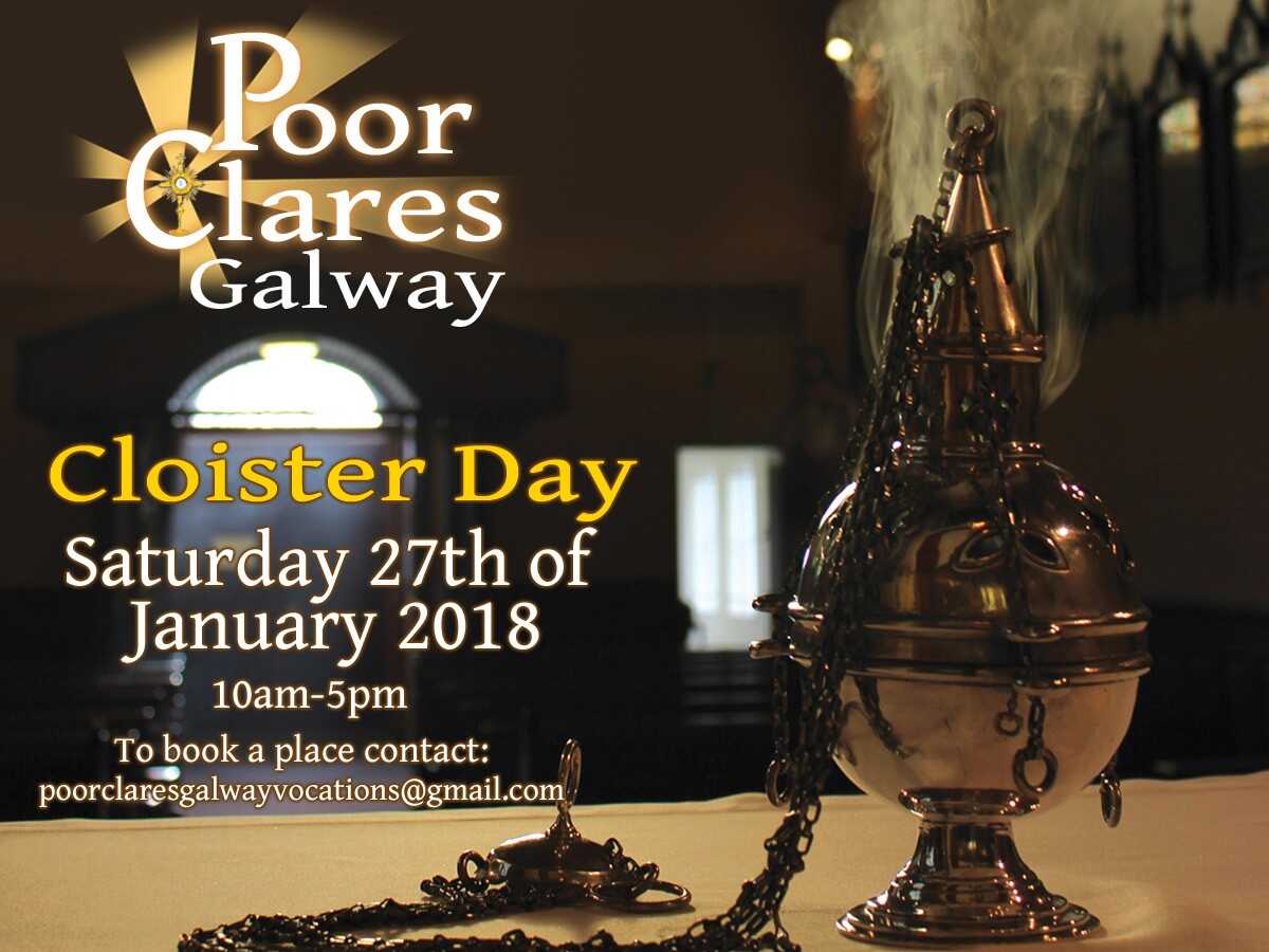 The Poor Clares in Galway are hosting a Cloister day on Saturday, January 27th from 10am to 5pm. The day is designed to help young women between the ages of 21 and 40 to find out more about the Poor Clare way of life with a view to vocation discernment. To book a place contact:
