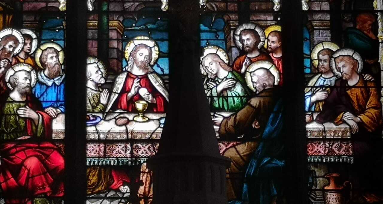 Image: the stained glass window of the Last Supper is from the window above the Altar in the Blessed Sacrament chapel, St Eugene's Cathedral, Derry.