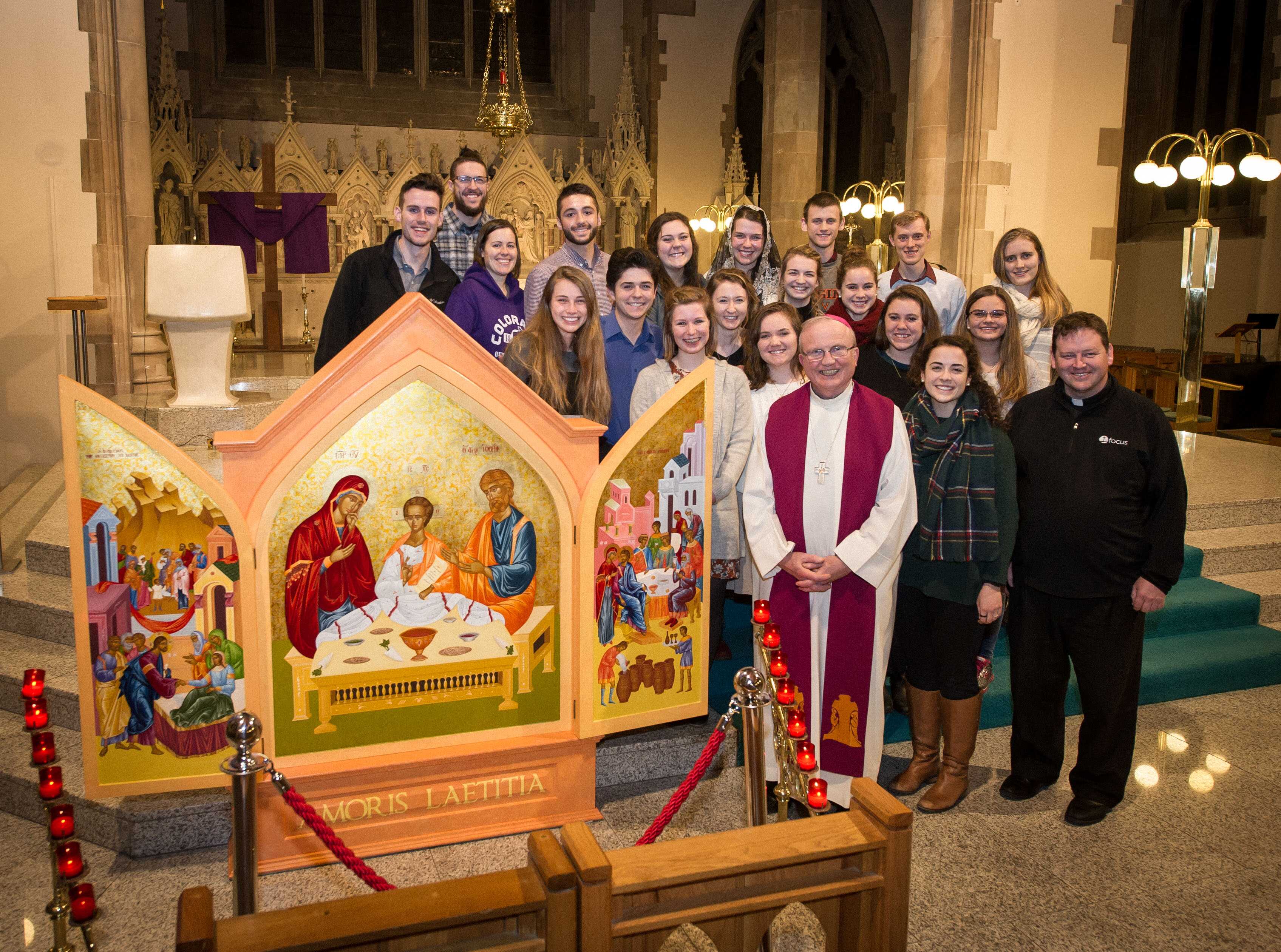 Bishop McKeown and a group of Focus Missionaries at the reception of the World Meeting of Families Icon to St Eugene's Cathedral Derry.